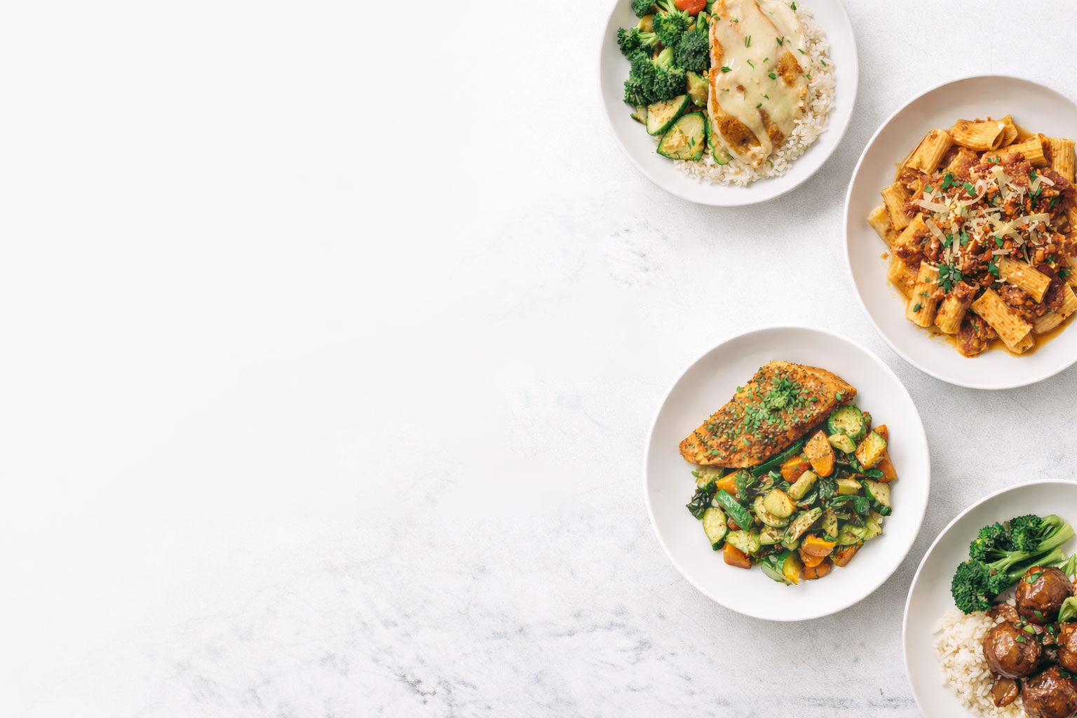 - Features tender turkey meatballs. Served atop gluten-free penne pasta, fresh basil pomodoro sauce, and a side of lightly steamed broccoli, with parmesan cheese packaged separately.