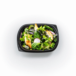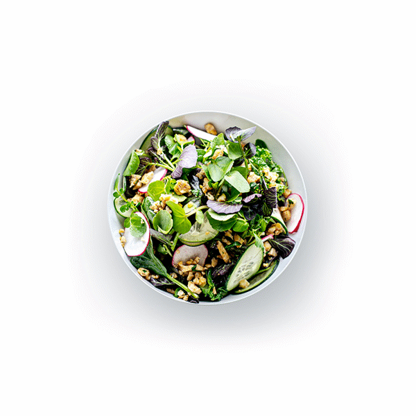- Fresh, wholesome ingredients with your choice of protein. Made with leafy greens, cucumber, radish, and a bright orange vinaigrette, this salad comes with your choice of oven-baked crispy chicken, shrimp, or tempeh.